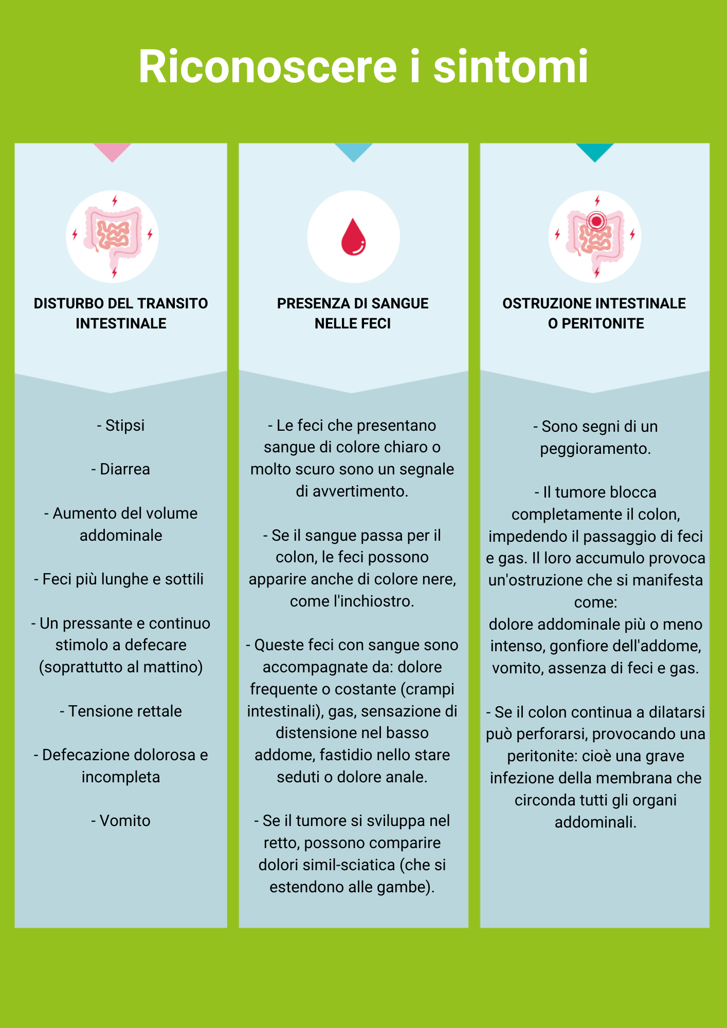 L’assenza di sintomi è frequente. Il cancro del colon-retto può quindi svilupparsi silenziosamente e può rimanere non diagnosticato per molto tempo. Da qui la necessità di screening. Tuttavia, alcuni segnali possono indicare la necessità di consultare il medico di famiglia.