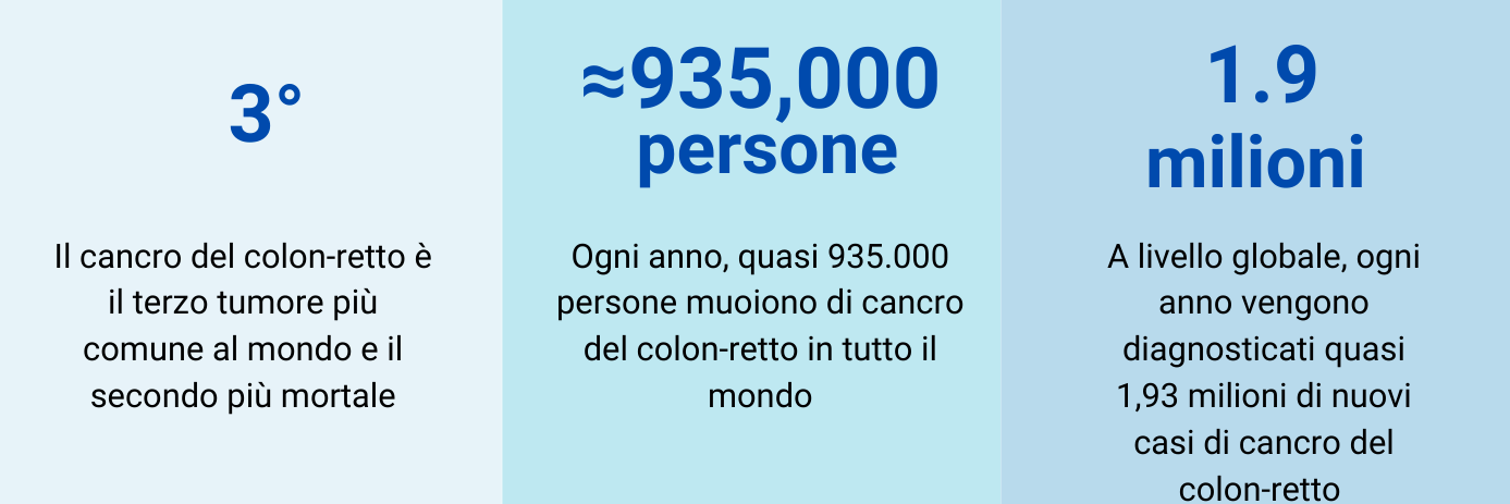 Il cancro colorettale è un tumore che causa ogni anno, nel mondo, circa 690.000 decessi. È uno dei tumori più frequenti al mondo: è al terzo posto indipendentemente dal genere, preceduto dal cancro ai polmoni e al fegato (a livello globale, ogni anno vengono diagnosticati quasi 1,4 milioni di nuovi casi).