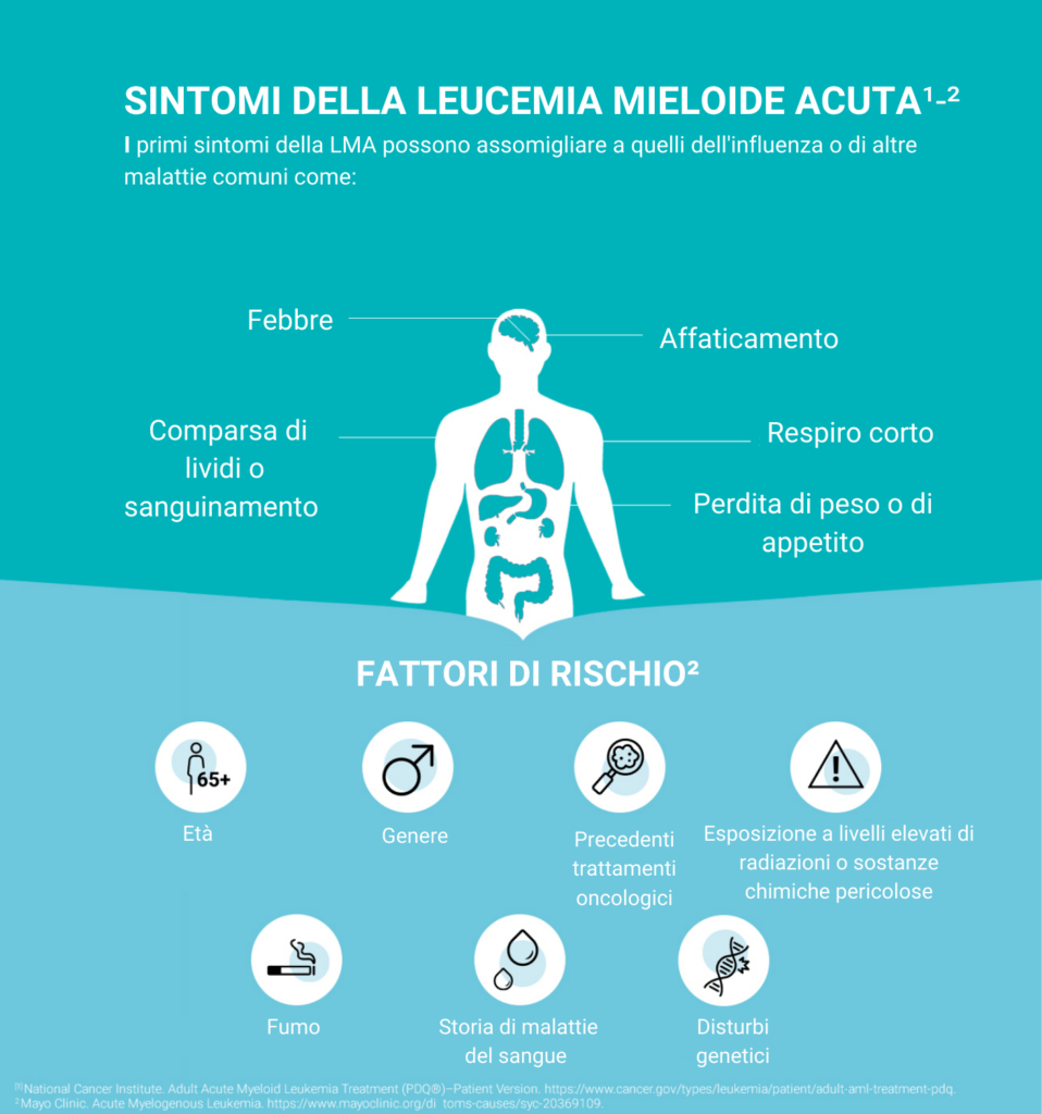 Nella maggior parte dei pazienti con LMA la causa certa è sconosciuta. Esistono però fattori di rischio come l’esposizione ripetuta al benzene (fumo di sigaretta, prodotti petroliferi, ambiente di lavoro con benzene), alcune malattie genetiche come l’anemia di Fanconi o la sindrome di Down, più comunemente nota come Trisomia 21, alcune chemioterapie, la radioterapia o alcuni tumori e malattie del sangue. Questi fattori di rischio possono modificare il DNA delle cellule del sangue situate nel midollo osseo e contribuire allo sviluppo della malattia.
